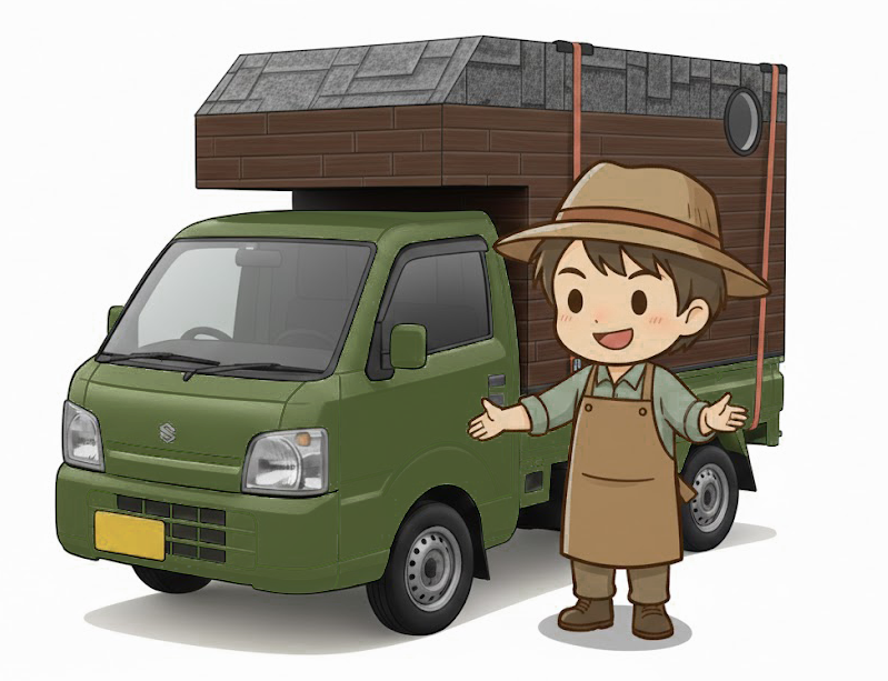 大きな絵を運ぶために、軽トラの荷台に積載するキャンピングカーを自作。